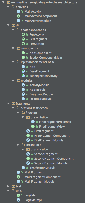 There is an implementation of a logger Log4MeImpl and its interface that will be injected as well, doing something more interesting. There is a list of injections as a singleton in the app where the app registers all the injected objects with the aim of print that list in the last loaded fragment. Then we will get the result of the injection, in order to check if injected object where living at the expected context.